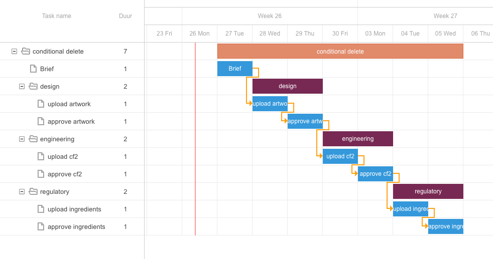 The button “Previous tasks“ at the end of the startdate field, gives an overview of all of the upstream and not connected tasks in the current project. Downstream tasks are not mentioned in this list.